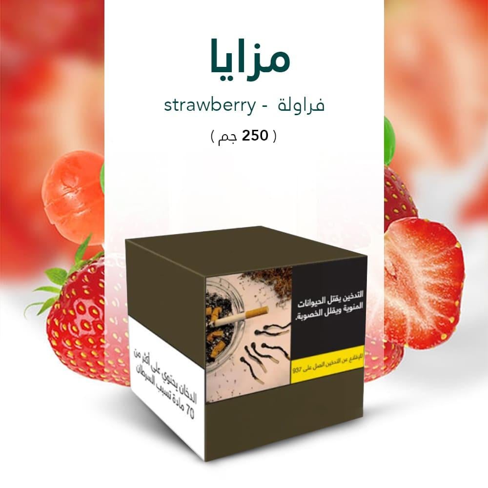 💨 عِش تجربة فاكهية منعشة مع معسل مزايا بنكهة الفراولة. نكهة طبيعية حلوة تجمع بين حلاوة الفراولة ونضارتها، لتمنحك جلسة شيشة مميزة بطعم فاكهي ناعم يدوم طوال الوقت. مثالية لعشاق النكهات الحلوة والفواكه الطازجة.